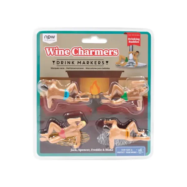 - Wein-Charmers-Getränkemarkierer: Set mit 4 hübschen Kerlen, die dich bei einem Glas Wein kennenlernen möchten.