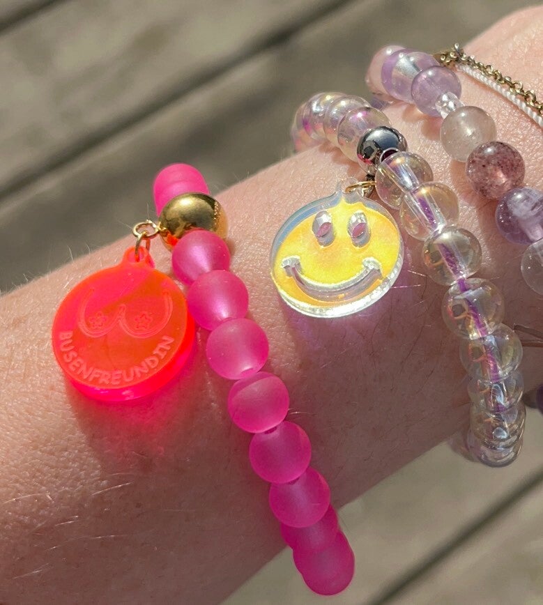 Armband mit gefärbten pinken Glasperlen und "Busenfreundin" Anhänger.