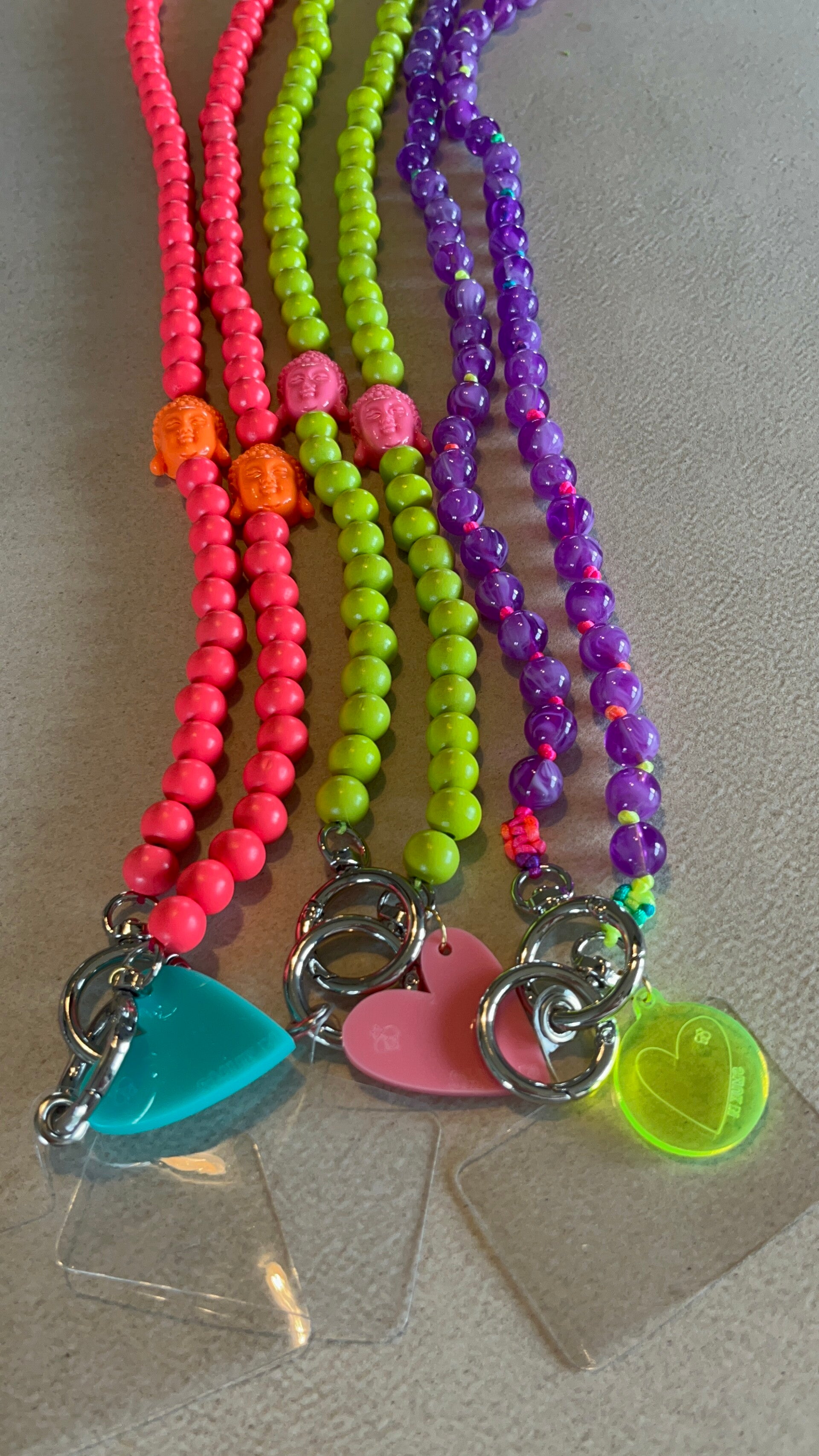 Die Handykette in Koralle und hellgrün bestehen aus Holzperlen, die Kette in lila aus Acrylperlen.