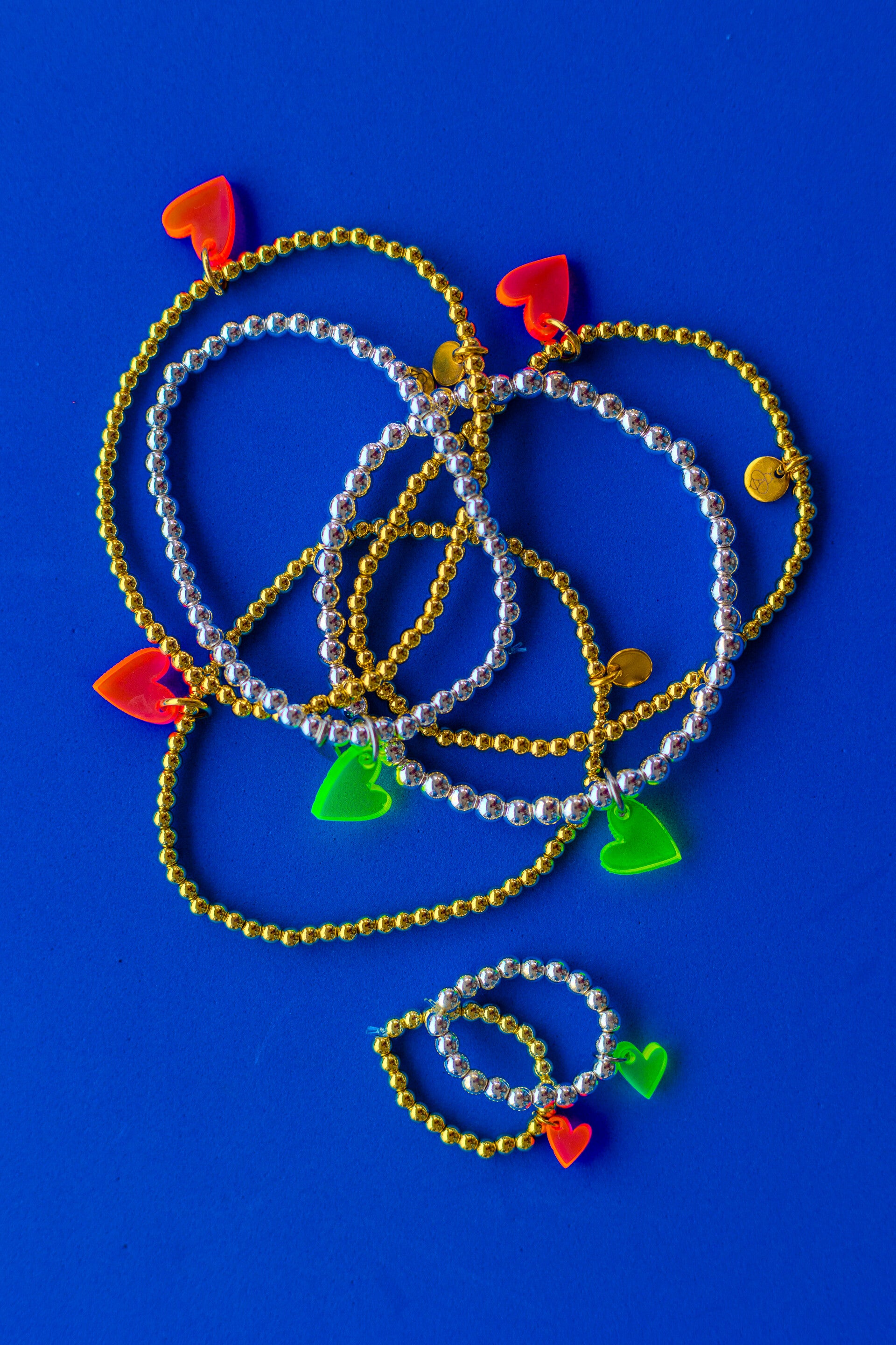 Armband aus versilberten Edelstahl mit neongelbem Herz. Passt sich jeder Größe an.