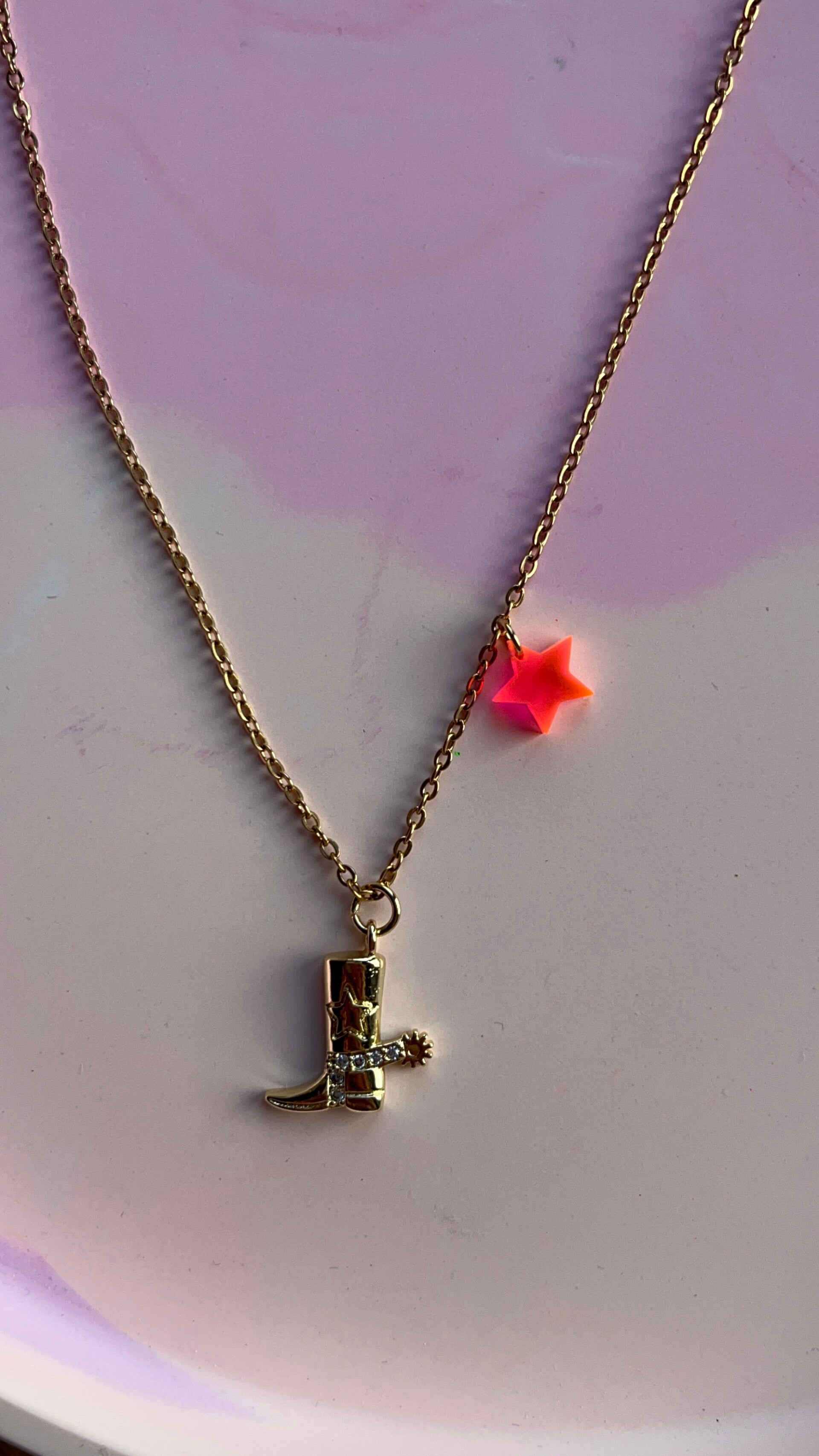Kette mit Cowboystiefel Anhänger aus vergoldetet Edelstahl und Acryl Stern.