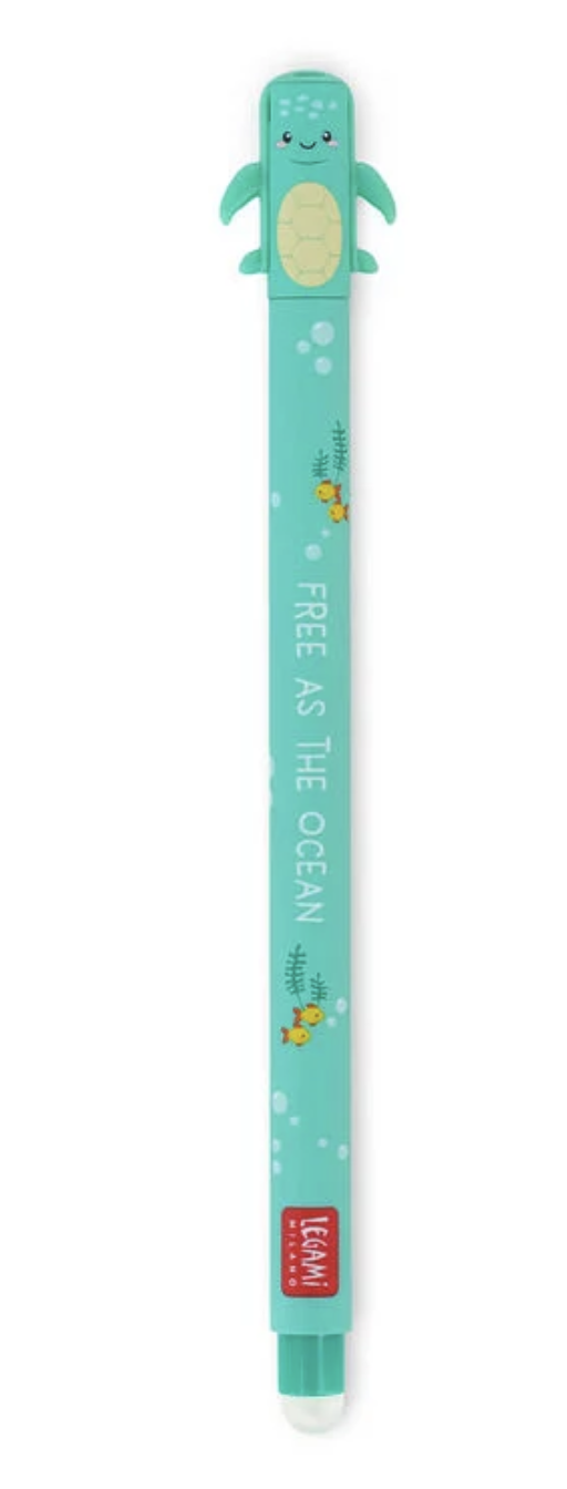 Mit dem löschbaren Gelstift - Erasable Pen mit Schildkröte-Motiv von Legami kannst du jedes Mal in die Vergangenheit zurückkehren, wenn es dir passt. Die Kugel an einem Ende arbeitet inkognito und beseitigt die thermografische Tinte, ohne das Papier oder sich selbst abzunutzen..