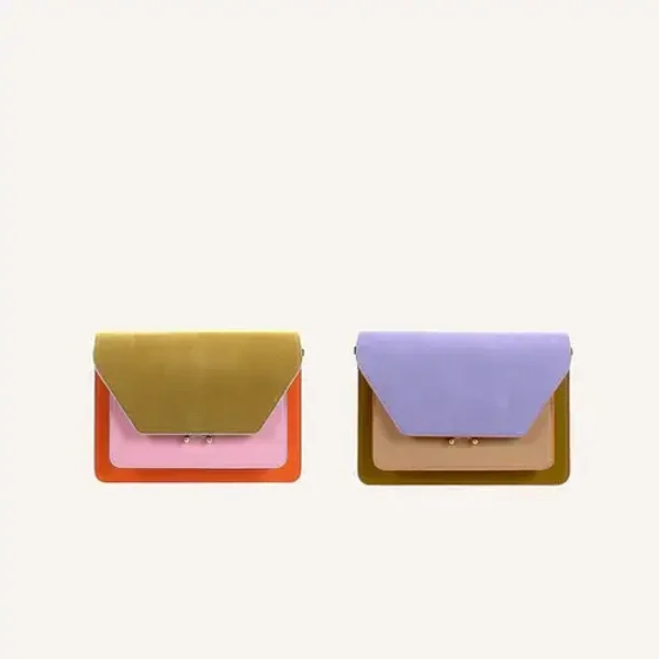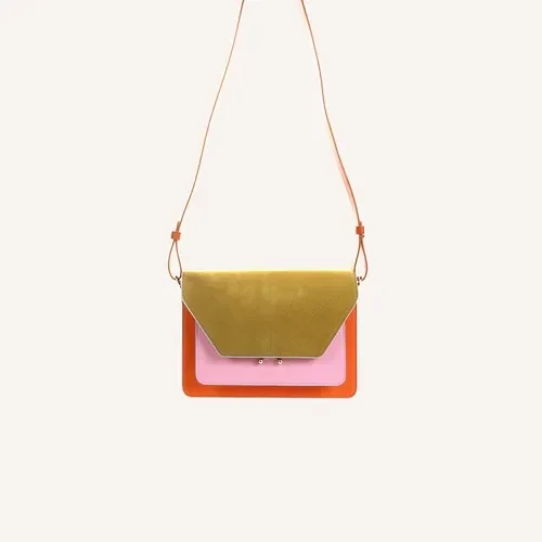 Eine Umhängetasche in Orange und Costa-Grün mit zwei verschiedenen, abnehmbaren Griffen: einem verstellbaren veganen Lederriemen und einem gestreiften Gurtband. Die Tasche ist aus hochwertigem veganem Leder gefertigt und hat eine Klappe aus veganem Wildleder. Das Futter besteht aus coolem und schickem gestreiftem Canvas und der goldene Reißverschluss auf der Innenseite ist von YKK. Die Umhängetasche hat eine Vordertasche und zwei Fächer. Jede Tasche wird in einem Staubbeutel geliefert, damit Sie Ihre Tasche aufbewahren können, wenn Sie sie nicht verwenden.