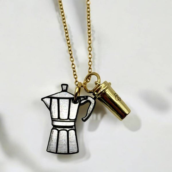 Feine Gliederkette mit Anhänger aus Acryl und Coffee-to-go Becher aus vergoldetem Edelstahl.