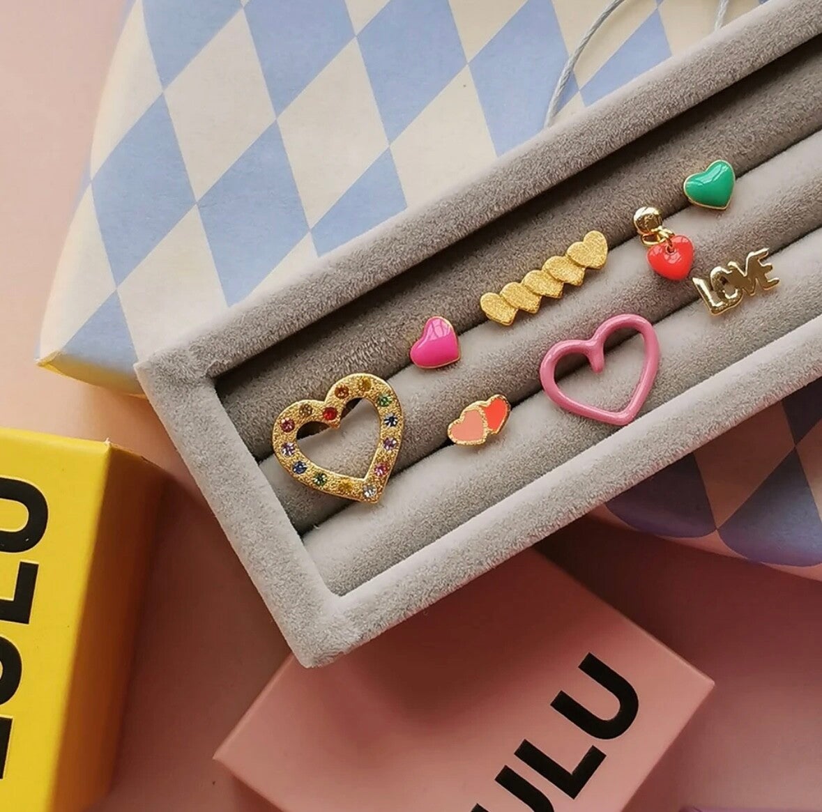 Wenn du LULU nicht kennst, solltest du wissen, dass wir eine herzensgute Marke sind. Mit den LOVE U-Ohrringen wollten wir einen voluminösen Look auf ein kleines Design reduzieren. Die Herzen mit farbiger Emaille sind an der Oberfläche abgerundet, während die Herzen in Gold und Silber eine glatte Oberfläche haben.
